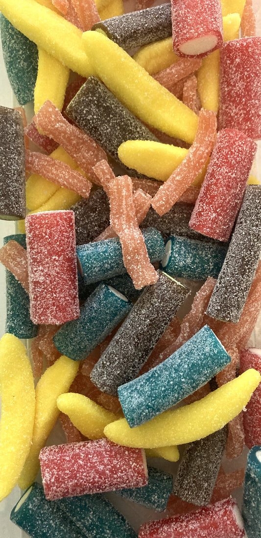 Réf B5 89 – Box 5 - Bonbon en forme de Mini câble et Banane Acide, Bonbon Halal sachet de 500 g.