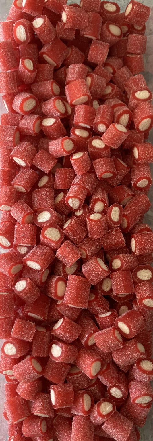 Réf DA 94 - Bonbon aux fruits en forme de Bouchée de Mini câble gout Fraise acide, Bonbon Halal - Sachet de 100 gr.