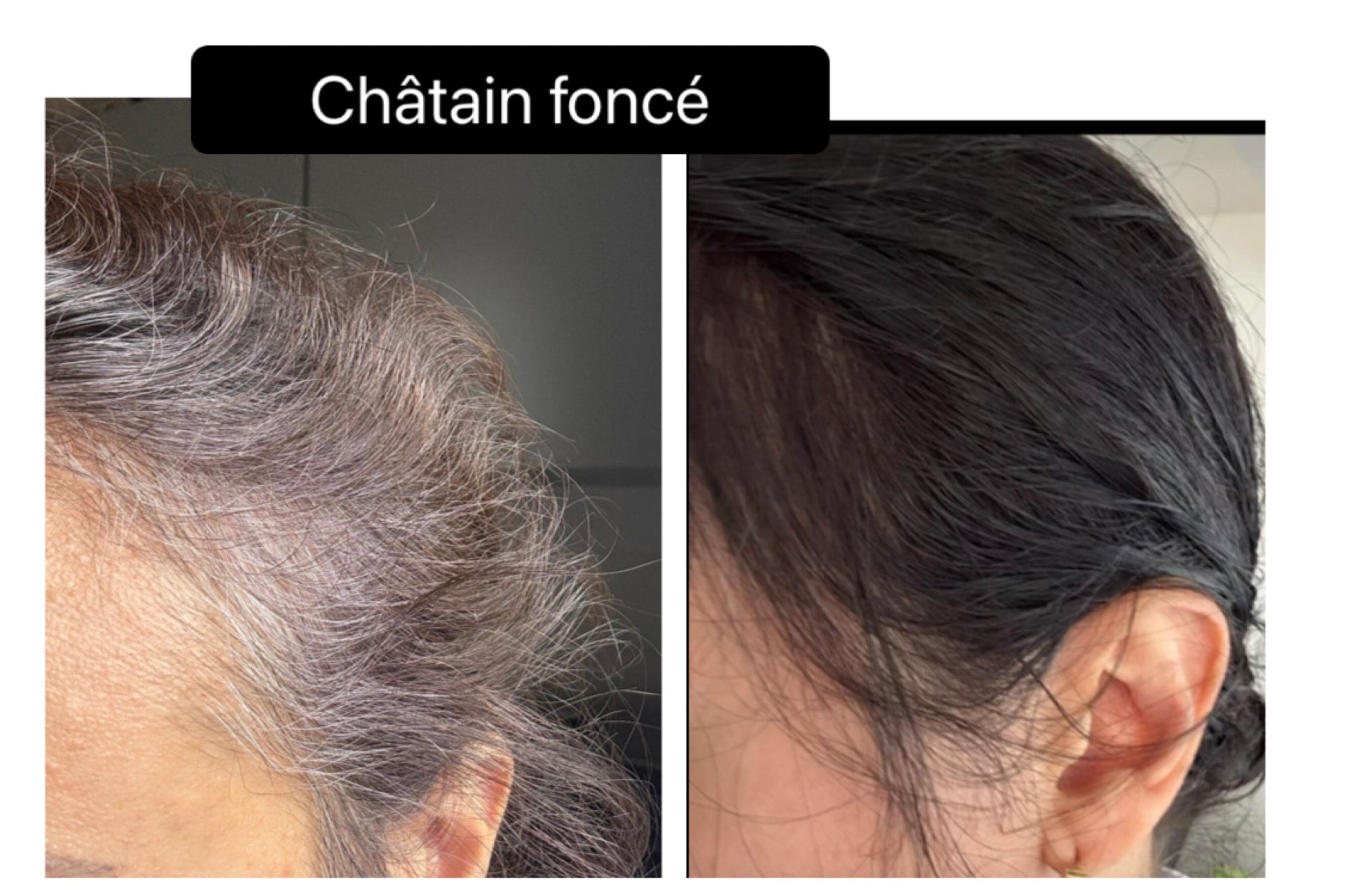 La coloration végétale chatain foncé et auburn ma recouvert tous mes cheveux blanc et mes cheveux sont magnifiques je suis choquée du résultat merci énormément