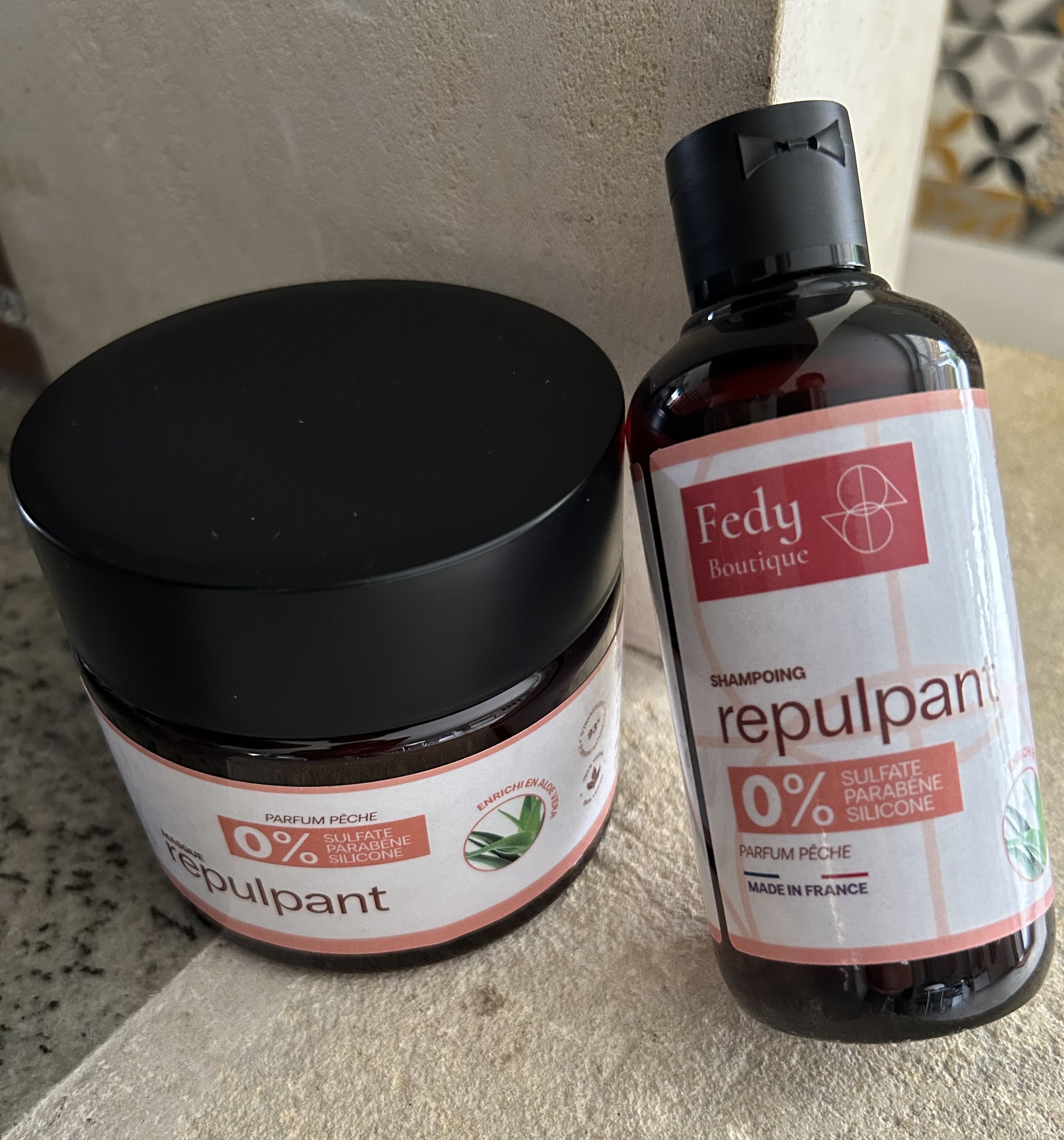 SHAMPOING FABRICATION FRANCAISE, SANS SULFATE, SANS PARABENE, SANS SILICONE - Léger parfum pêche - EXISTE ÉGALEMENT EN MASQUE - 98.6% des ingrédients sont d'origine naturelle. Notre shampoing repulpant Acide Hyaluronique avec 3 formules spécialement développées pour les cheveux abimés et/ou cassants. L'acide Hyaluronique connus pour ses propriétés hydratantes exceptionnelles est l'ingrédient clé de notre shampoing. Il pénètre dans la fibre capillaire pour retenir l'humidité, laissant vos cheveux intensément hydratés et repulpés. Vos cheveux retrouvent une apparence plus dense avec une texture plus rebondie et une élasticité améliorée. L'Acide Hyaluronique évite la casse des cheveux et limite les pointes fourchues et lisse la fibre capillaire. L'aloe vera est un excellent soin hydratant, nutritif et gainant grâce à sa richesse en polysaccharides. Apaise et régénère les cuirs chevelus sensibles. Huile de ricin fortifie les cheveux. Gaine et nourrit les cheveux abimés et maltraités par les permanentes, décolorations ... Réputée pour favoriser la croissance des cheveux. Mode d'emploi: Étaler le shampoing sur l'ensemble de la chevelure. Ajouter de l'eau puis émulsionner. Rincer et répéter si nécessaire. Précautions: Tenir hors de portée des enfants. Ne pas avaler. En cas de contact avec les yeux rincer immédiatement avec de l'eau. INGREDIENTS (INCI): Aqua, Sodium Cocoyl Glutamate, Glycerin, Decyl Glucoside, Lauryl Glucoside, Propylene Glycol, Sodium Chloride, Tamarindus Indica Seed Gum, Parfum, Sodium Benzoate, Guar Hydroxypropyltrimonium Chloride, Potassium Sorbate, Xanthan Gum, Inulin, Aloe Barbadensis Leaf Juice Powder, Hexyl Cinnamal, Linalool, Coumarin, Ctronellol, Sodium Hyaluronate Flacon de 200 ml